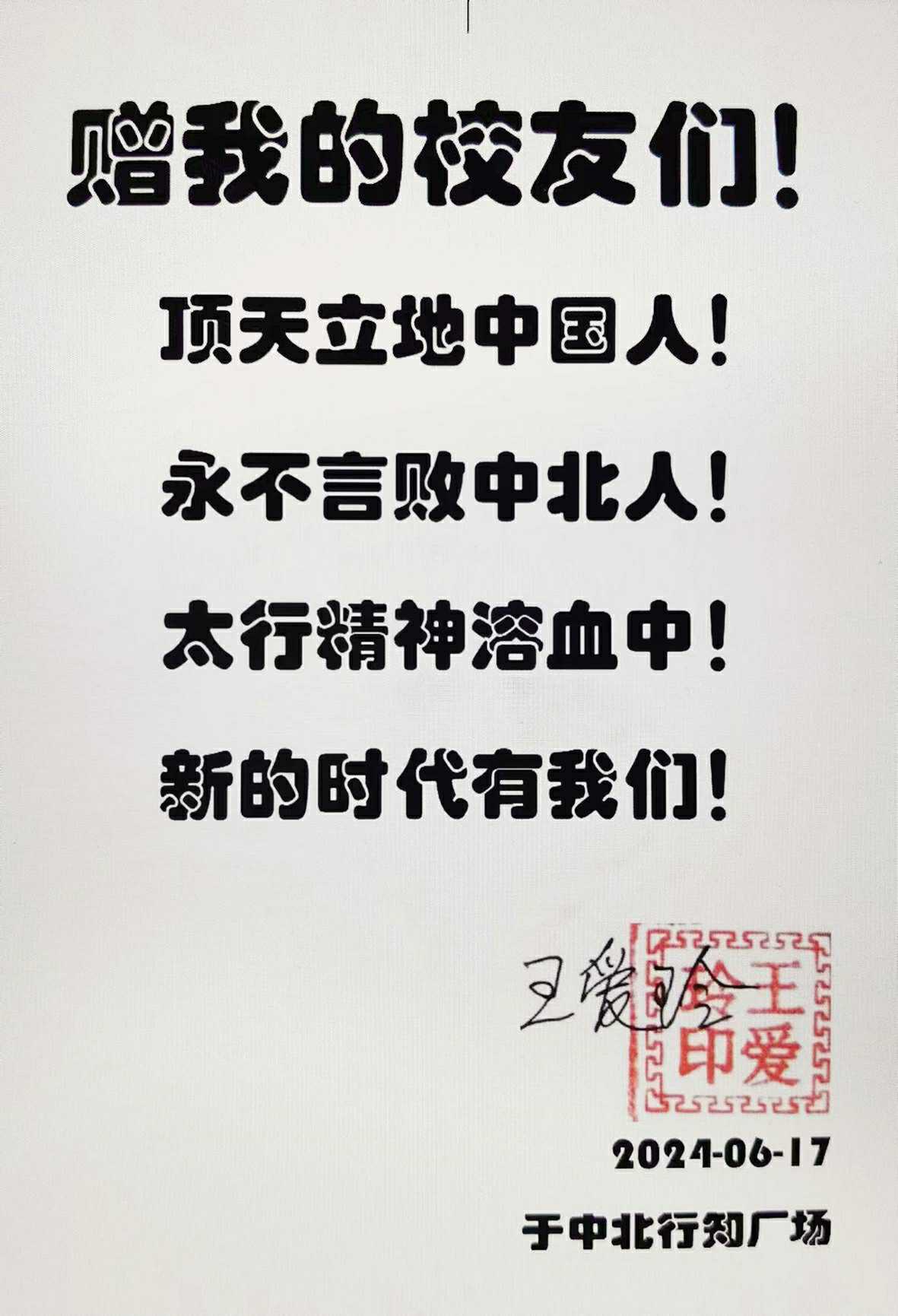 堂堂正正做人,扎扎实实做事(做学问)!做“顶天立地的中国人”!把革命先烈用鲜血和生命凝聚的、伟大的太行精神这一“红色基因”注入每一个中北人的心中!做太行精神的传承人=做“敢于挑战、应战、从不言败的中北人!”