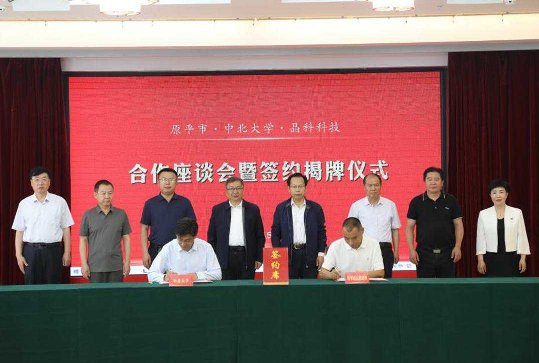本报讯 5月21日,我校与原平市人民政府、晶科电力科技股份有限公司合作签约暨揭牌仪式在原平市举行。校党委书记张晓永与原平市委书记冯小宁共同为“中北大学科技成果转化基地”“中北大学智库合作基地” 等创新平台揭牌。副校长来志斌代表学校签署合作协议。