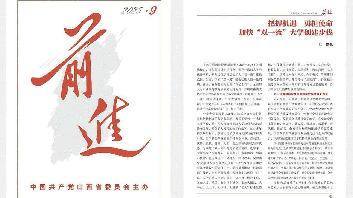 本报讯 近日,中共山西省委主办的《前进》杂志2025年第9期刊登我校校长陈钱撰写的题为《把握机遇 勇担使命 加快“双一流”大学创建步伐》的理论文章。文章指出,《教育强国建设规划纲要(2024-2035)》明确提出,要加快建设中国特色、世界一流的大学和优势学科,聚焦优势学科适度扩大“双一流”建设范围。当前,国家“双一流”建设已进入新一轮周期,省委、省政府大力实施“百亿工程”,全面加大对山西高等教育发展的支持力度,并明确指出支持中北大学等高校加强优势学科建设,打造冲击“双一流”的学科梯队。中北大学重任在肩、机遇在前,学校党委必须深入回答好“如何抓住历史机遇,推动学校高质量发展”这一核心问题。