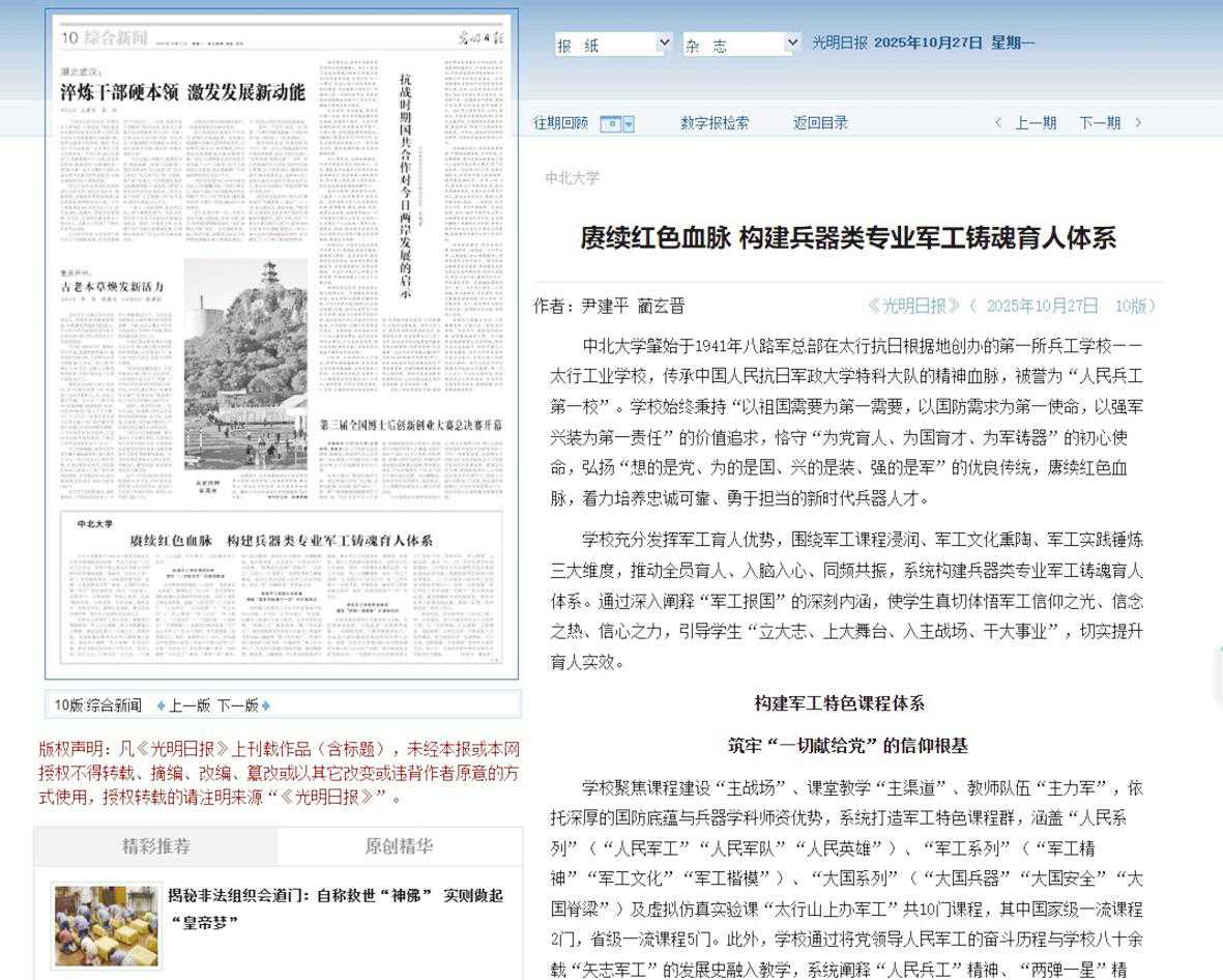 本报讯 10月27日,《光明日报》第10版“综合新闻”版刊发我校尹建平教授、蔺玄晋教授联合署名文章---《赓续红色血脉构建兵器类专业军工铸魂育人体系》,系统展现学校依托军工办学特色、创新人才培养模式的实践成果。
