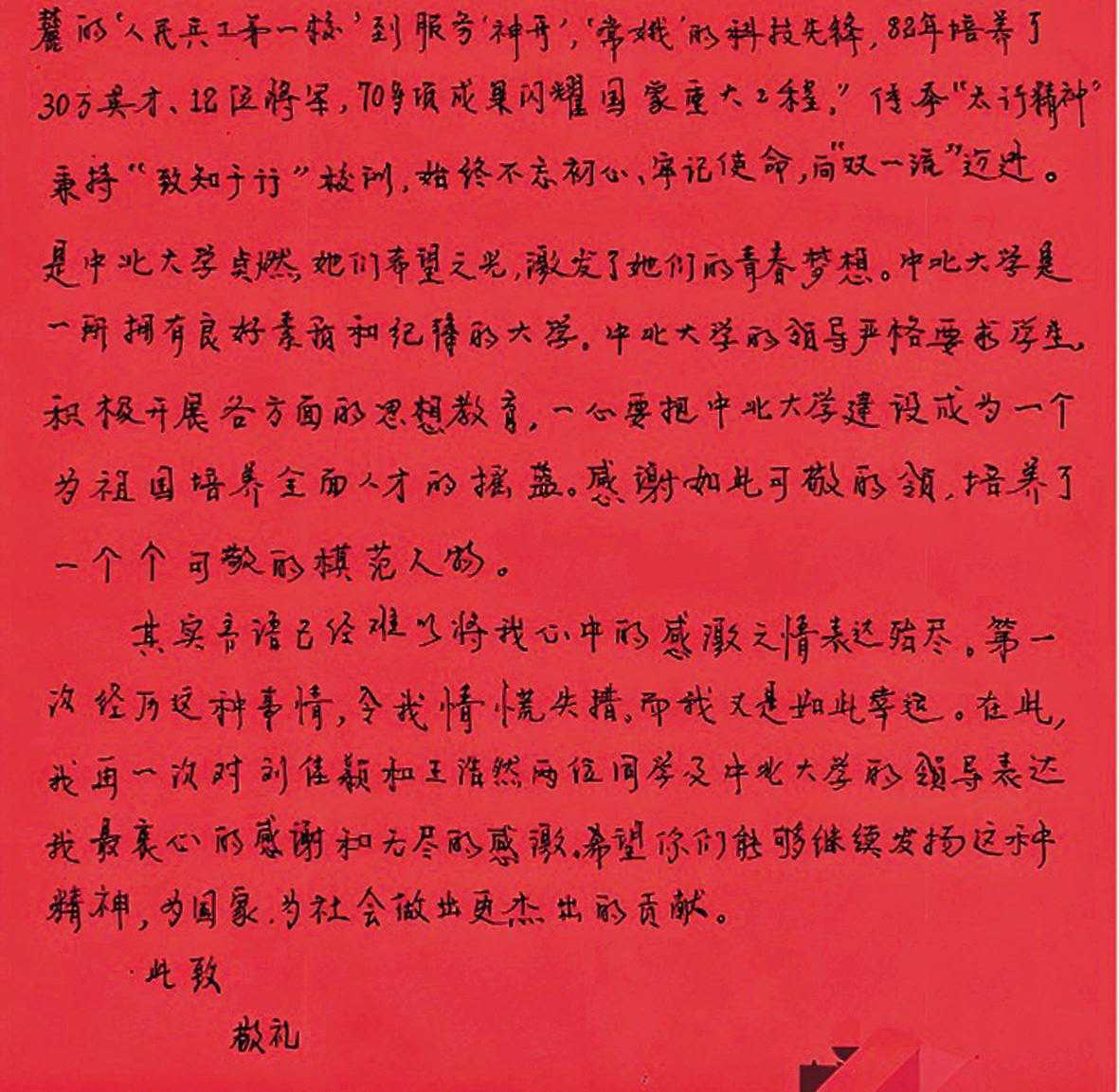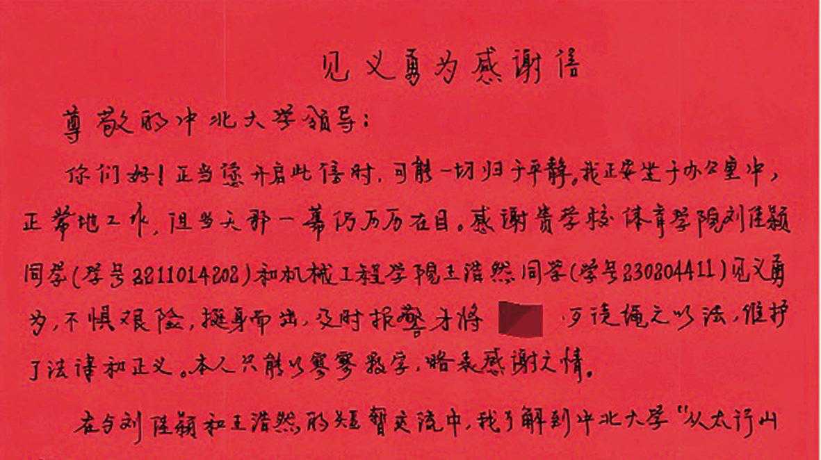事后得知,受伤的师先生当时正赶着参加重要会议,经治疗已无大碍。康复后,他专程来到学校,将一面印着“危难时刻伸援手,见义勇为显真情”的锦旗和亲笔感谢信,送到两位同学手中。信中写道:“感谢贵校刘佳颖、王浩然同学挺身而出,及时救助与报警,你们的担当让人动容……中北大学立德树人成效显著,培养的学子既有学识又有温度。”